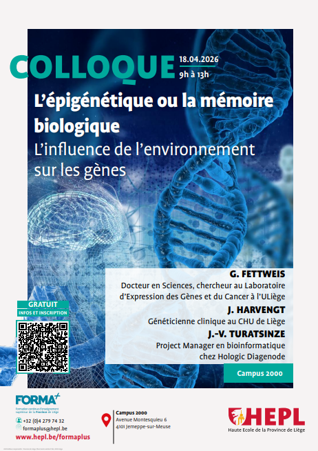 La HEPL et le Centre FORMA+ vous proposent la matinée du technologue de laboratoire médical abordant l'épigénétique ou la mémoire biologique : l'influence de l'environnement sur les gènes.
