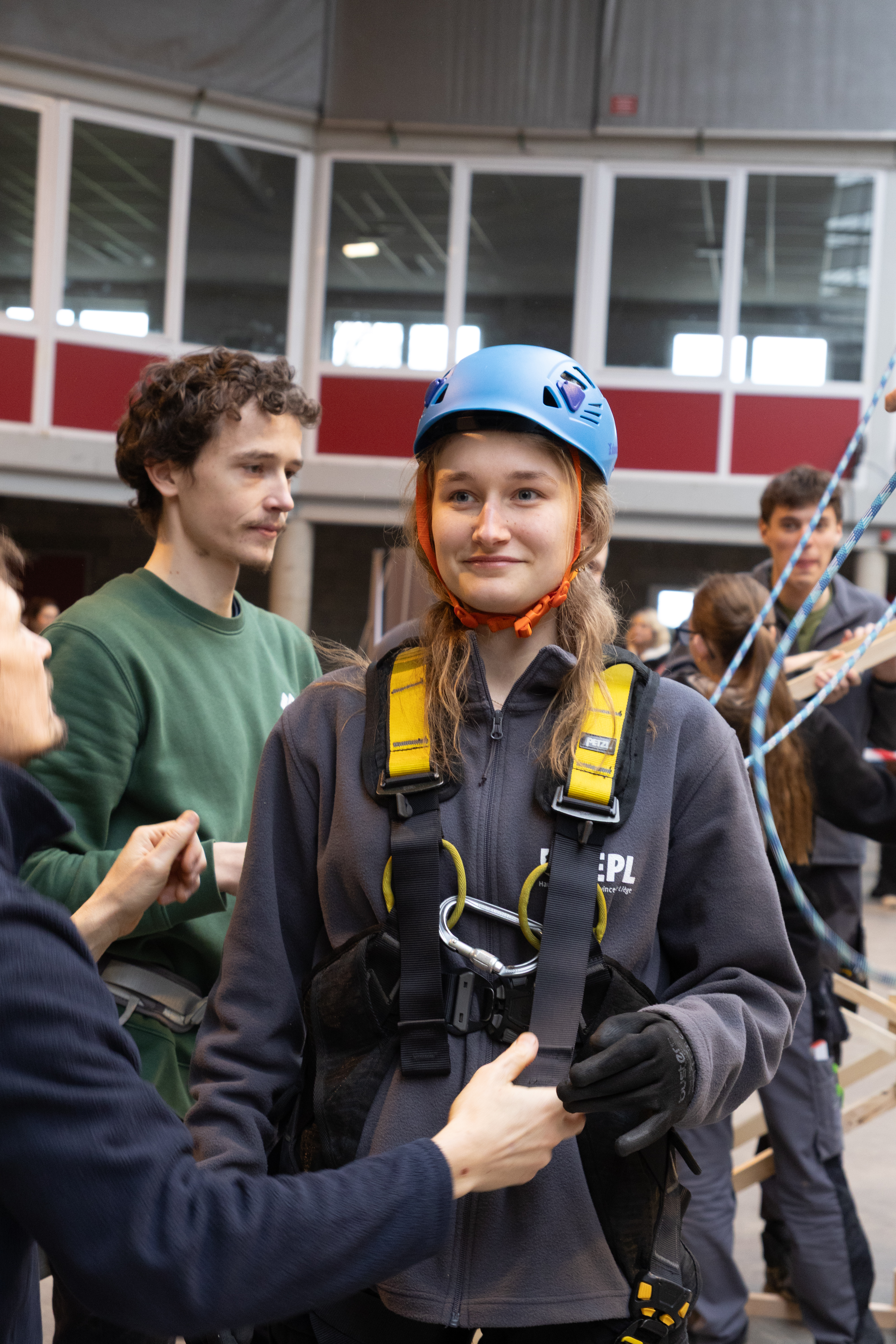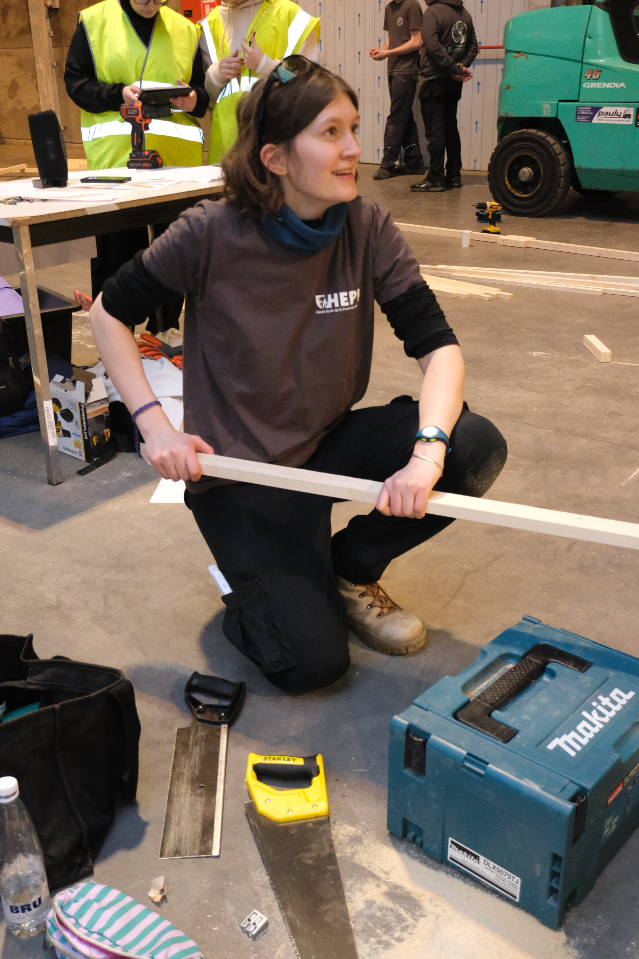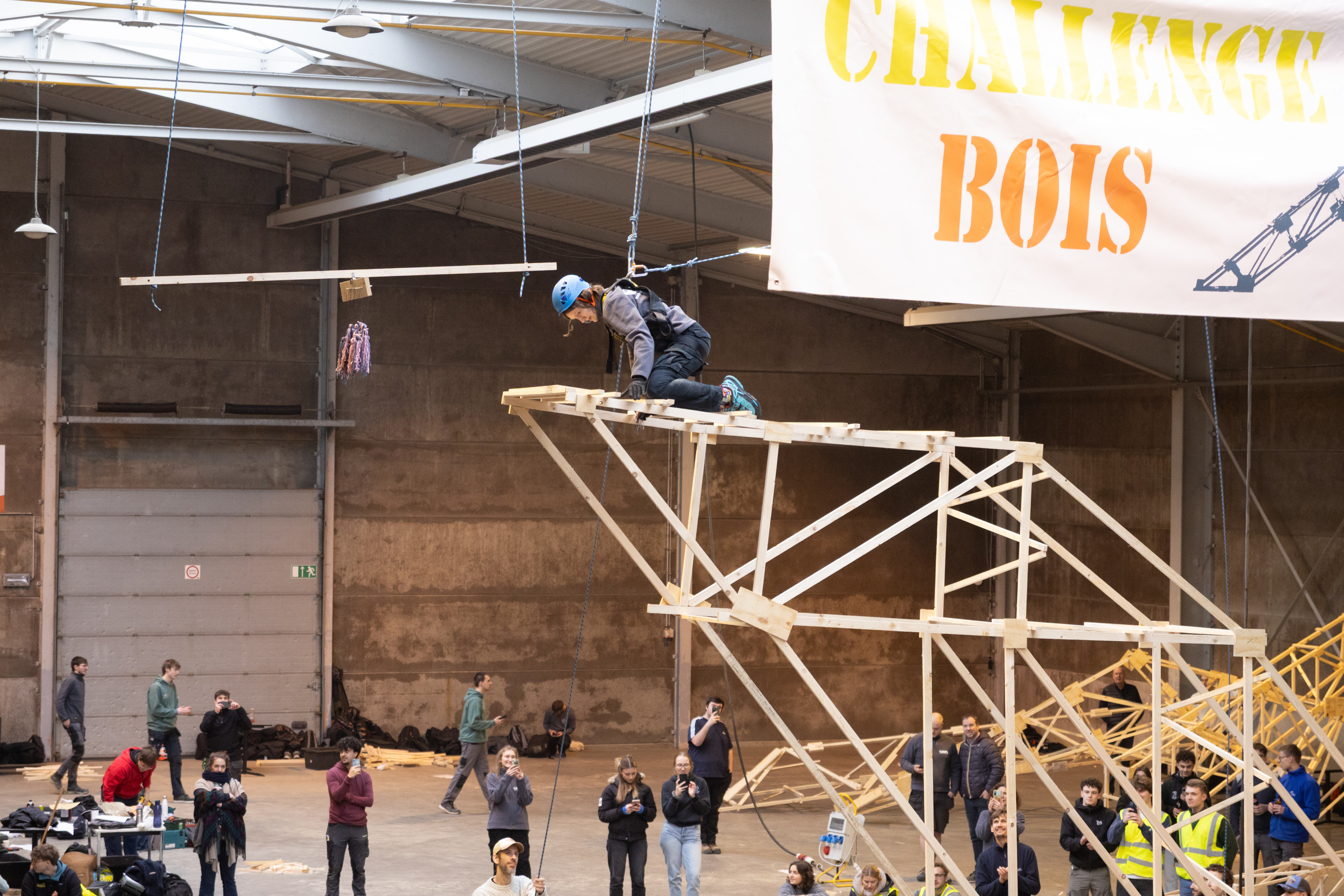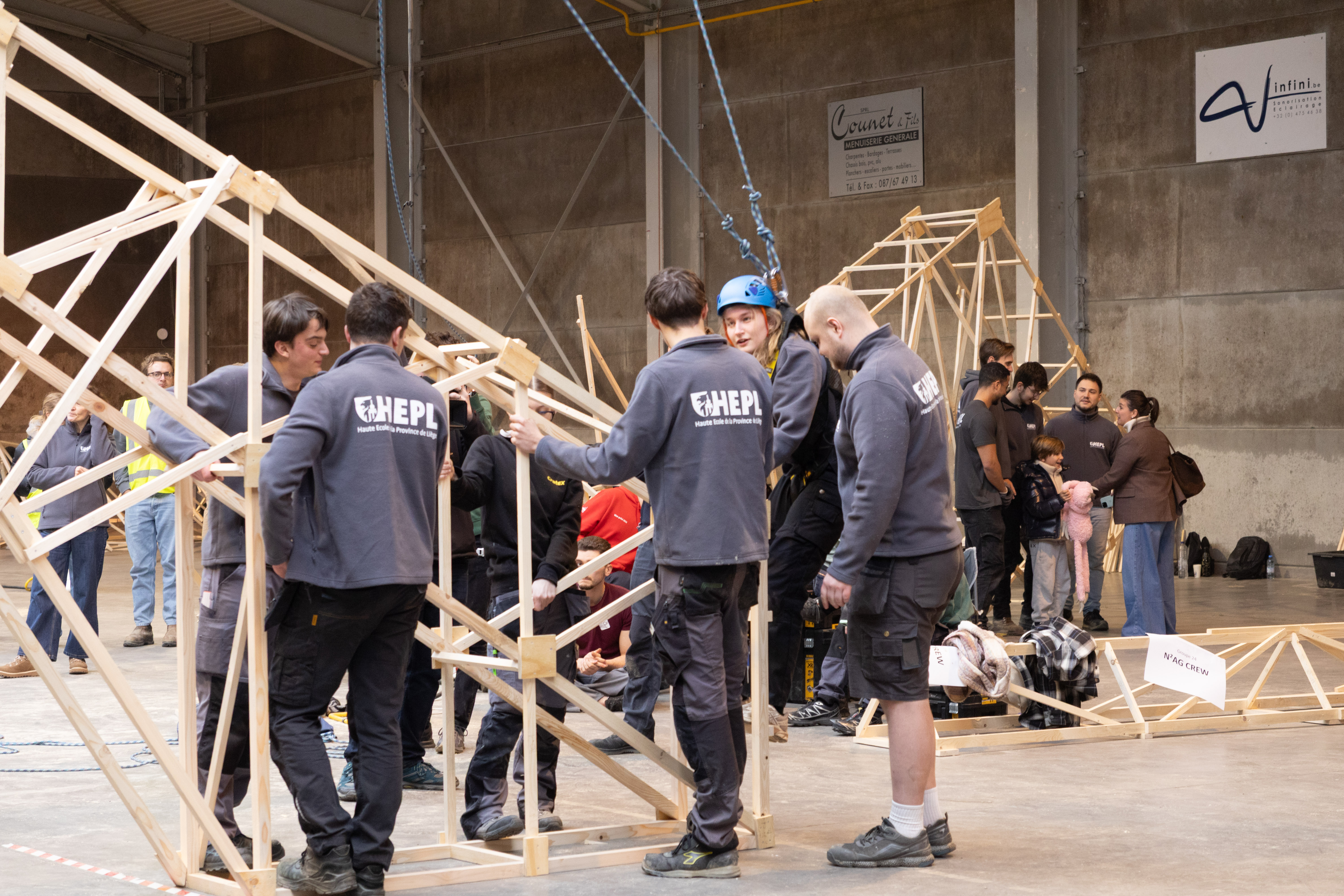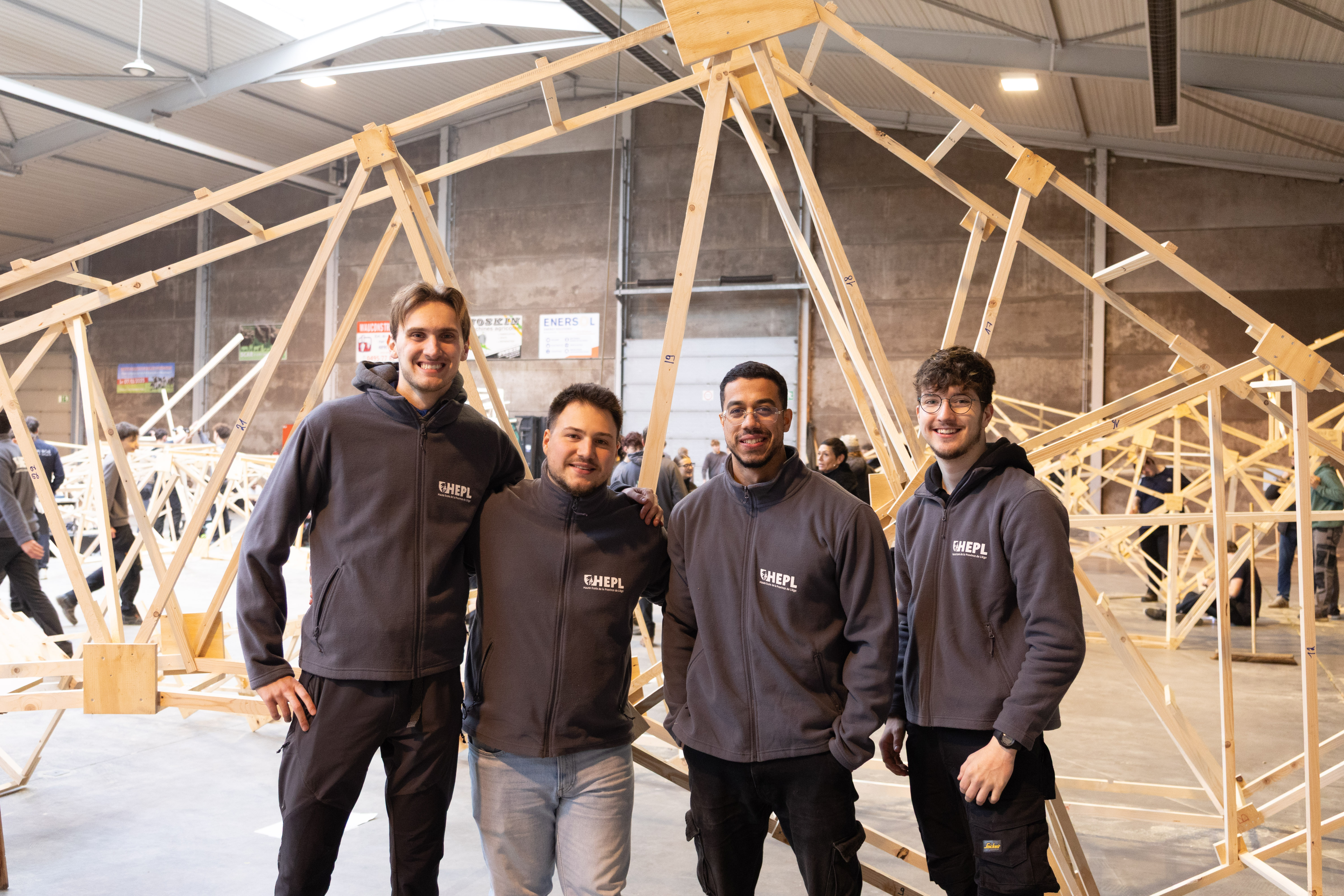 La mise en œuvre du Challenge Bois s’est déroulée sur le terrain à Herve. Durant les deux journées du Challenge, les équipes ont assemblé leur structure puis procédé aux tests. Elles ont été accompagnées par les élèves de l’Athénée Royal de Soumagne, qui ont apporté un soutien précieux pour les découpes du bois. Cette collaboration entre établissements souligne l’importance du travail collectif et du partage des compétences dans la réussite du projet.